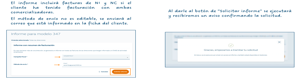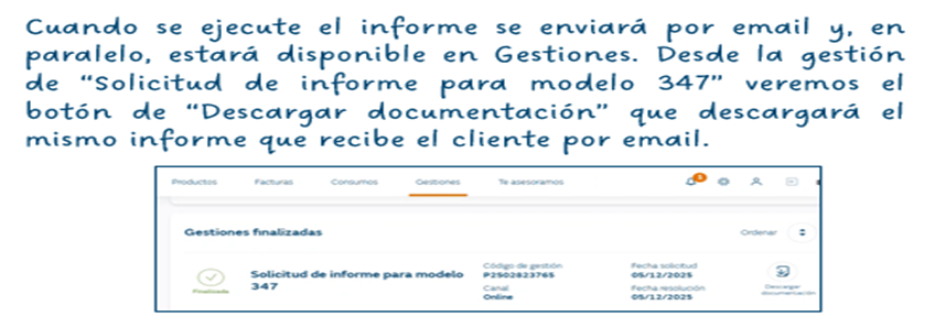 La solicitud realizada será visible en el apartado de gestiones, y el informe se enviará al correo informado en la ficha del cliente.