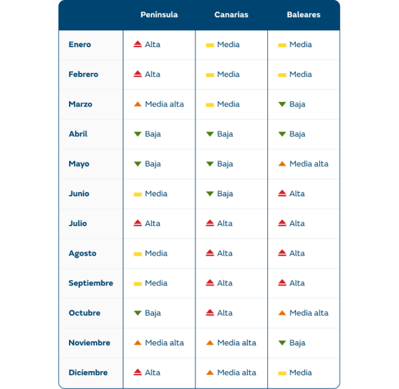Los precios de la energía y la potencia varían según la temporada del año, dividida en alta, media-alta, media y baja.