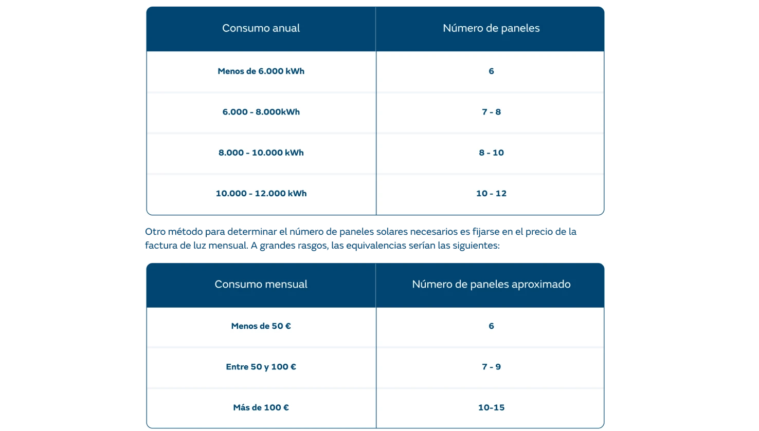Una vivienda típica puede necesitar entre 4 y 18 módulos de placas fotovoltaicas. La cantidad será mayor o menor en función de cómo es el consumo anual de electricidad, ya que puede ser bajo (menos de 5.000 kWh), medio (entre 5.000 y 7.500 kWh) o alto (más de 7.500 kWh). En la siguiente tabla, detallamos el número de paneles necesarios por kWh de consumo:​